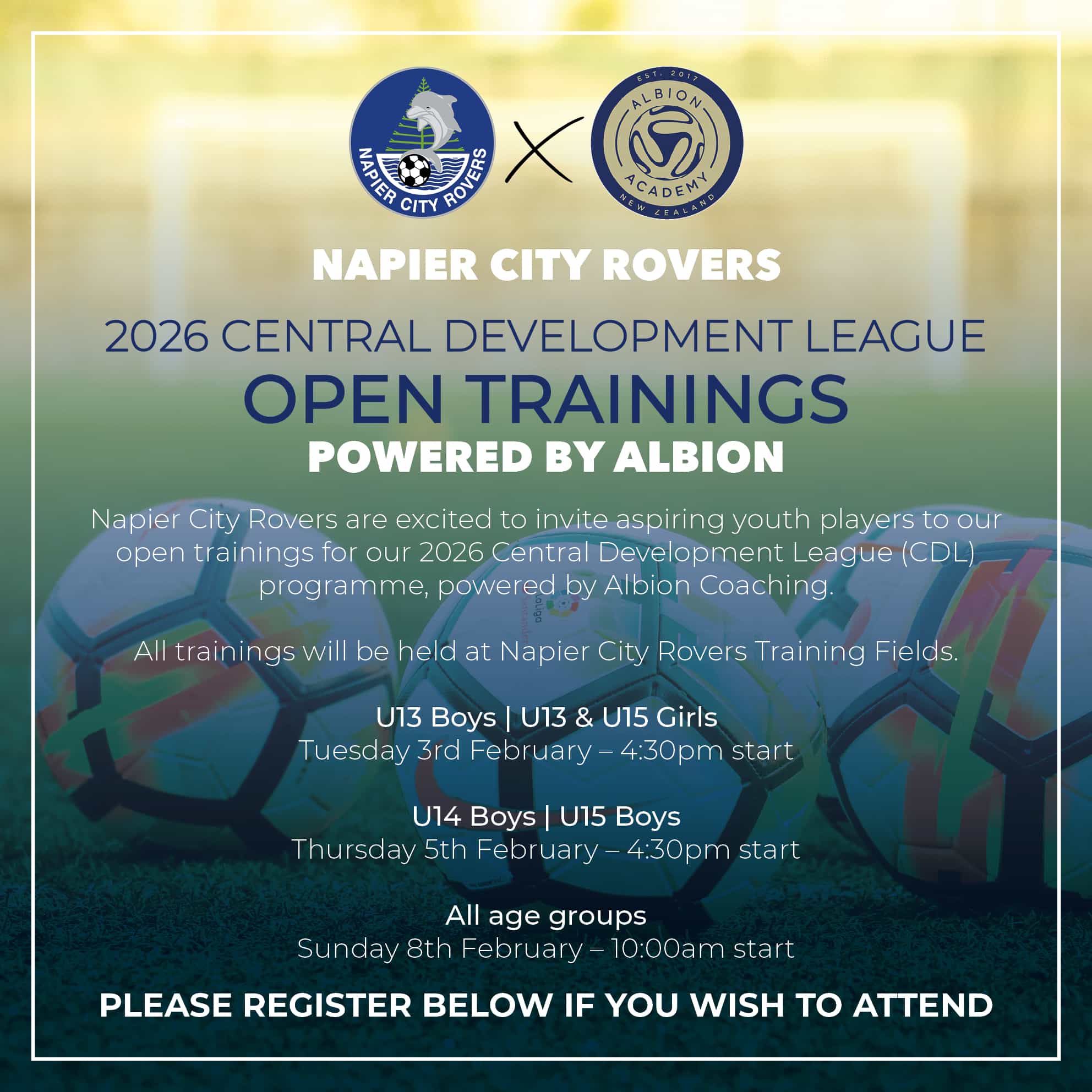 Napier City Rovers are excited to invite aspiring youth players to our open trainings for our 2026 Central Development League (CDL) programme, powered by Albion Coaching.